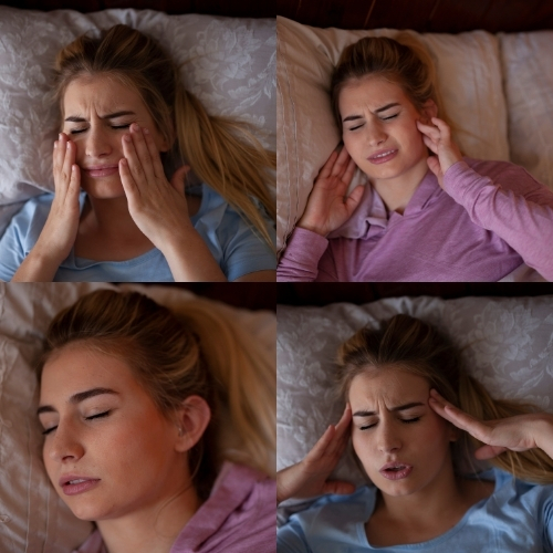 - Problemas en la articulación (ATM): Chasquidos o dolor en la articulación temporomandibular.